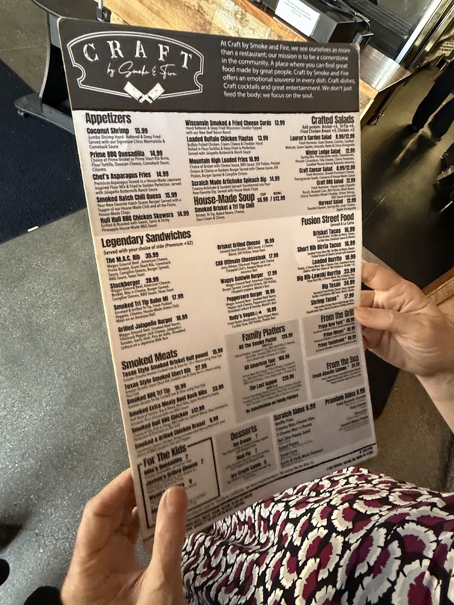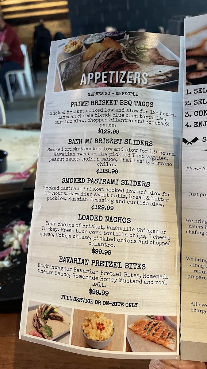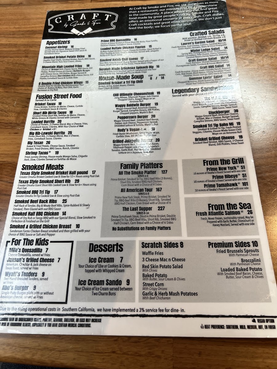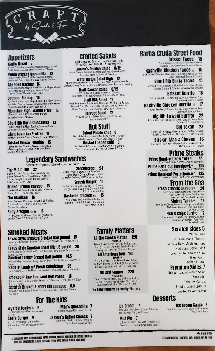 The menu offers a variety of barbecue and American-style dishes suitable for casual dining. It is organized into several main sections including salads and soups, sides, and add-ons to complement the main offerings. Visitors can expect a selection that includes both lighter options like salads and chili, as well as hearty items such as smoked brisket, ribs, and various sandwiches and wraps featuring prime cuts of meat.